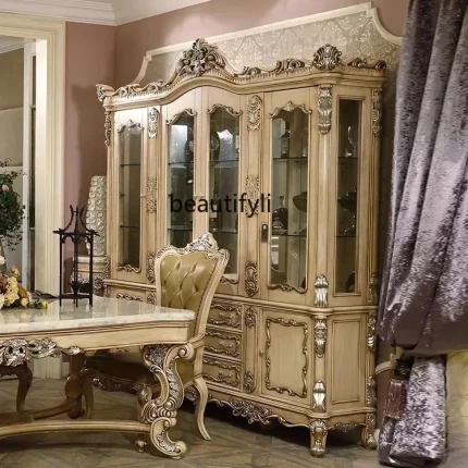V cqyFrench Solid Wood Glass Wine Cabinet Luxury Four-Door Tea Cupboard Living Room Display Cabinet
